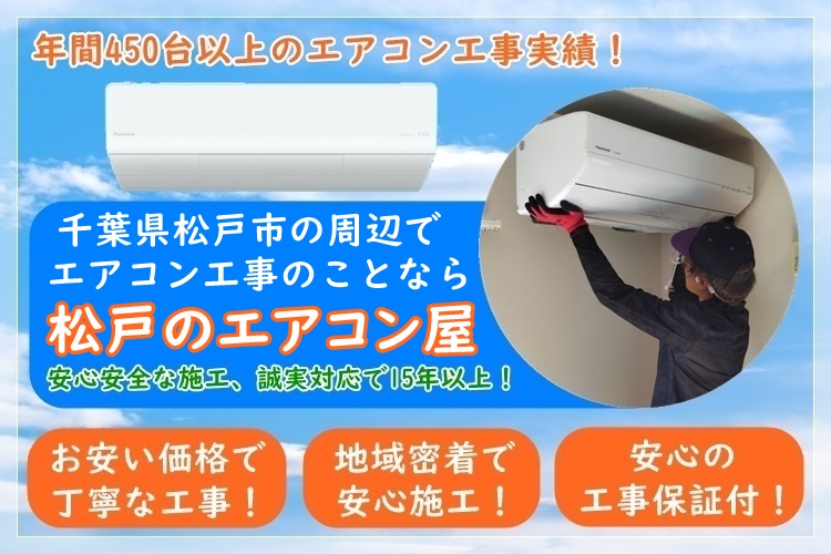 松戸のエアコン屋は家庭用のエアコン工事を主にエアコン取り付け・取り外し工事をおこなっている地域密着のエアコン業者で、松戸市を中心に千葉県で活動しております。